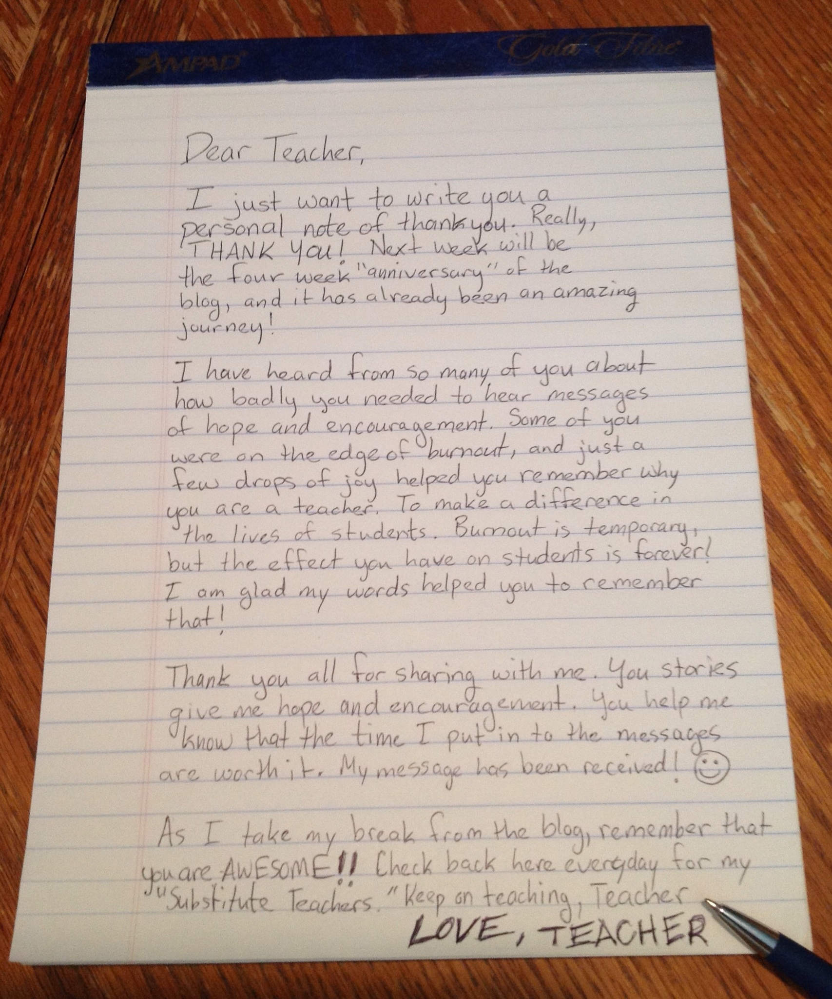 Teacher, you are making a difference and have done amazing work this year! You are so awesome! Please know that everything you went through this year was worth. You have had a greater effect than you will ever know. Thanks for all that you do! Hold on…the year is almost over! Keep on doing the incredible things you do and keep on teaching, Teacher!